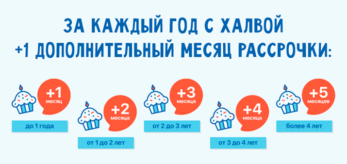 • Каждый год дружбы с Халвой принесет вам дополнительный месяц рассрочки на все крупные покупки. Дольше с Халвой - больше рассрочка!